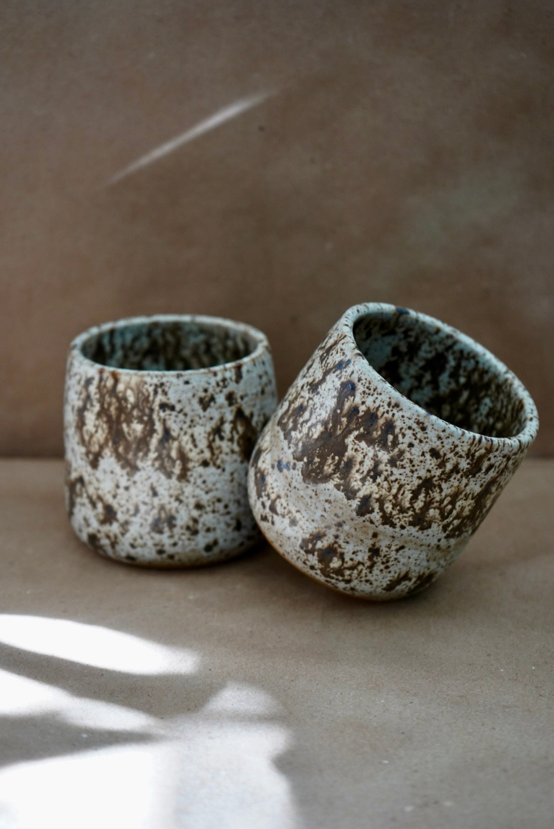 All pottery is thrown on the wheel by me, Janelle Stuart, in my home studio in Southern California where I reside with my husband, two sons—a three year old and 18 month old —and my very enthusiastic cattle dog!